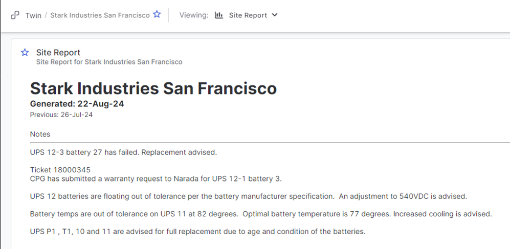 - There will be generic notes at the bottom of your report to remind you to look at your Corrective Actions section for a more detailed list of critical batteries, hardware issues, and temperature alarms.
